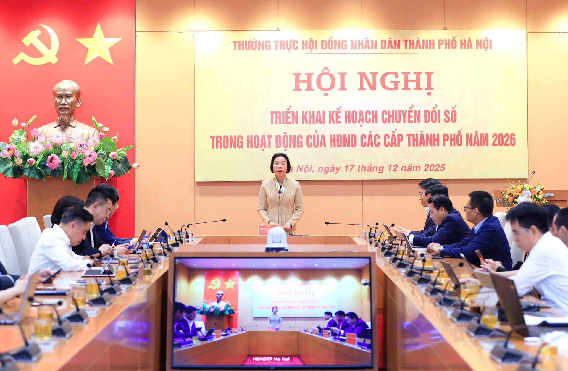 Hội nghị được tổ chức trực tuyến từ điểm cầu thành phố đến các xã, phường. Phó Chủ tịch HĐND thành phố, Phó Trưởng đoàn đại biểu Quốc hội thành phố Hà Nội Phạm Thị Thanh Mai chủ trì hội nghị.