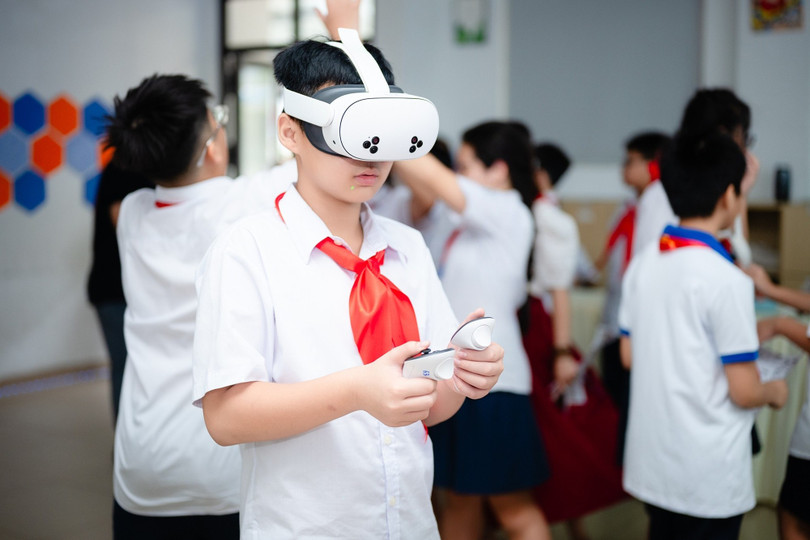 Học sinh Trường THCS Hoàng Mai trải nghiệm công nghệ thực tế ảo. (Ảnh: NTCC)