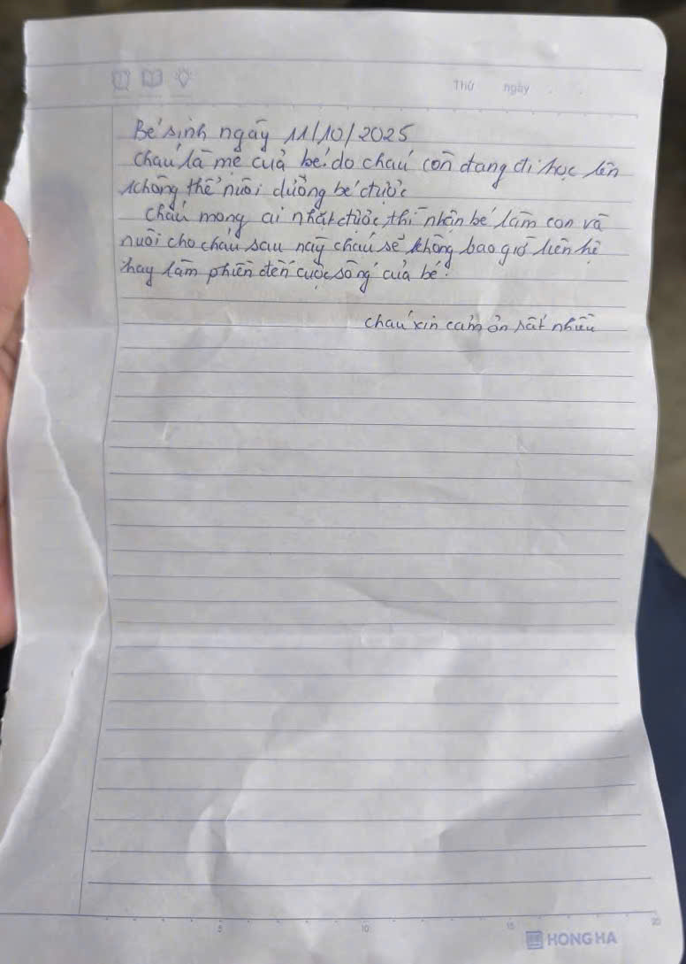 Trong thư viết: "Bé sinh ngày 11/10/2025. Cháu là mẹ của bé, do cháu còn đang đi học nên không thể nuôi dưỡng bé được. Cháu mong ai nhặt được thì nhận bé làm con và nuôi giúp cháu. Sau này cháu sẽ không bao giờ liên hệ hay làm phiền đến cuộc sống của bé. Cháu xin cảm ơn rất nhiều."