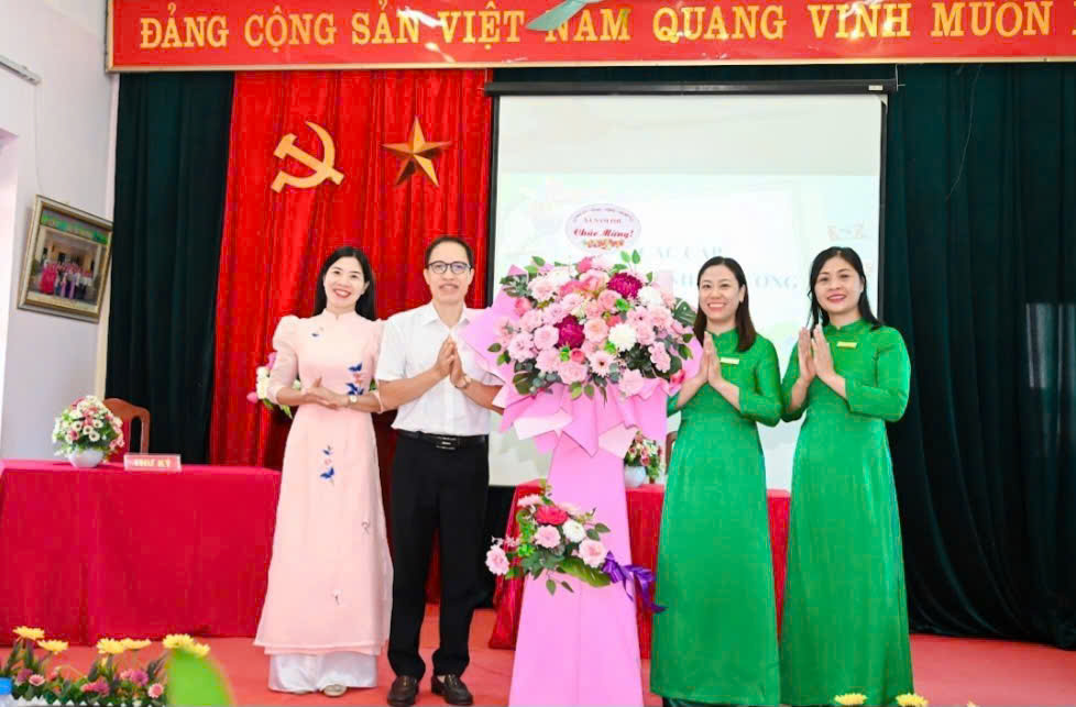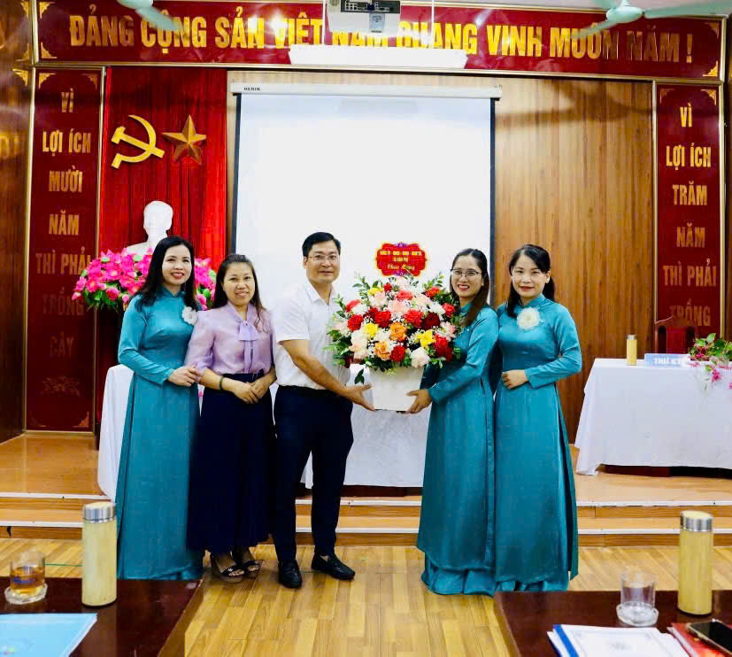Đồng chí Phạm Tiến Đạt – Trưởng Ban Xây dựng Đảng xã cùng lãnh đạo Phòng Văn hoá - Xã hội xã tặng hoa chúc mừng và phát biểu tại hội nghị CBVC-NLĐ Trường THCS Van Phúc