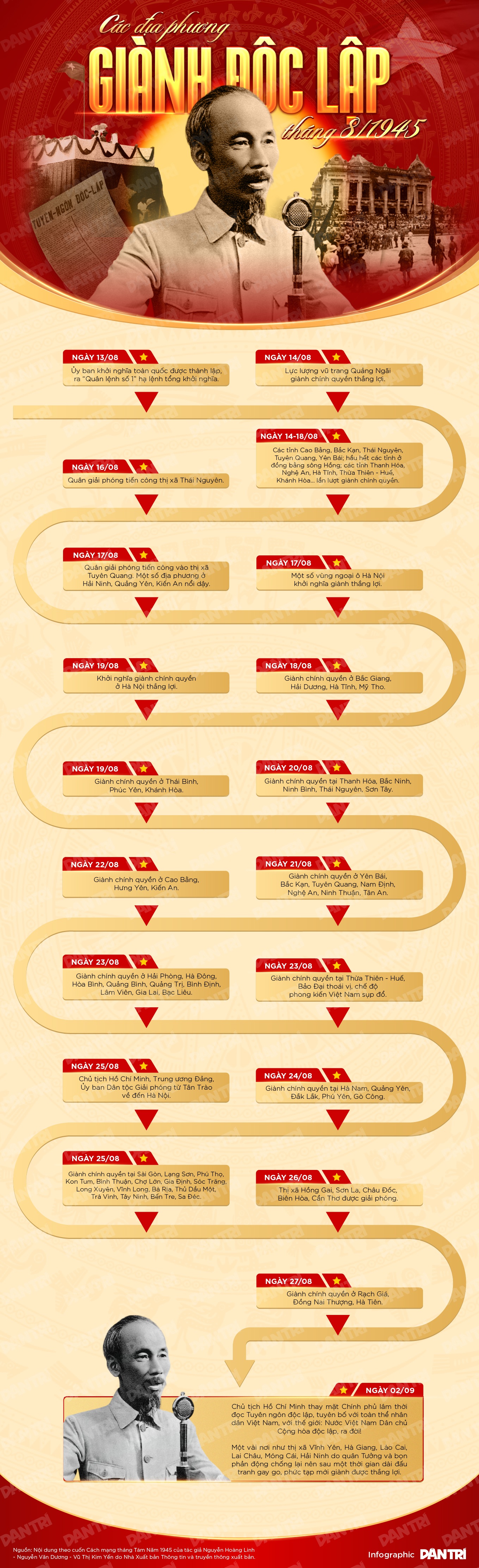 Cuộc tổng khởi nghĩa tháng Tám giành thắng lợi hoàn toàn chỉ trong vòng 2 tuần lễ. Ngày 2/9/1945 trở thành mốc son chói lọi trong lịch sử dân tộc và được xác lập là Ngày Quốc khánh của Việt Nam.